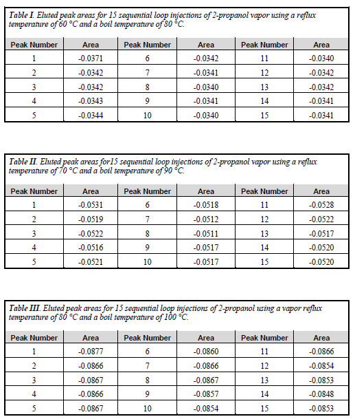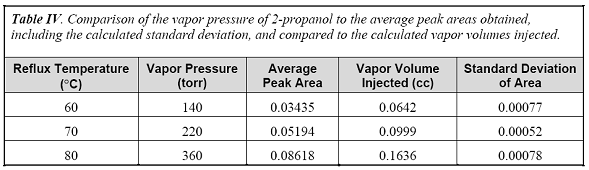 汇总数据见表四。三组不同温度下重复进样的积分峰面积的标准偏差均低于1%。实际蒸汽的进样体积与由异丙醇蒸汽压而得的预测值比较吻合。
