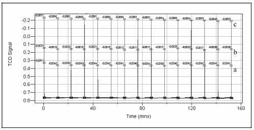 图1. 三个不同回流带温度下连续15次注入异丙醇蒸汽的时间与TCD信号输出图;(a)60 ℃(b)70 ℃(c)80 ℃。