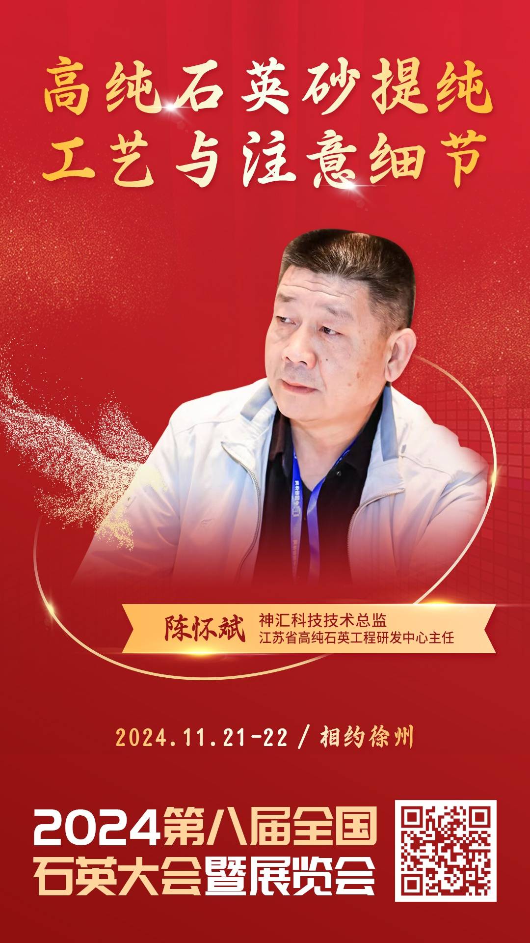 2024年11月21-22日,由中国粉体网主办的“2024(第八届)全国石英大会暨展览会”将在江苏徐州召开,江苏省高纯石英工程研发中心主任、神汇科技技术总监陈怀斌将做《高纯石英砂提纯工艺与注意细节》的报告。届时,他将结合多年高纯石英从业经验,详细解读高纯石英提纯理念以及在高纯石英提纯时需要注意的种种细节。