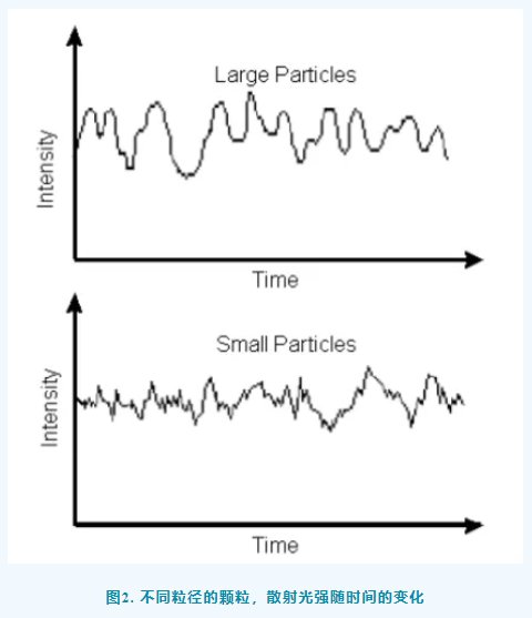 分散在溶液相的纳米颗粒由于受到溶剂分子的撞击,呈现出无规则的运动,我们称之为布朗运动(Brownian motion),如果我们将一束激光照射至含有该纳米颗粒的溶液中,溶液相中的颗粒会产生散射光,随后在一定的角度收集相关的散射光,我们就能得到如图2所示的散射光强随时间的变化曲线,可以看出大颗粒布朗运动较为缓慢,散射光强的变化频率较慢(图2,上)。小颗粒则相反,由于其布朗运动剧烈,接收到的散射光强的变化频率较快(图2,下)。