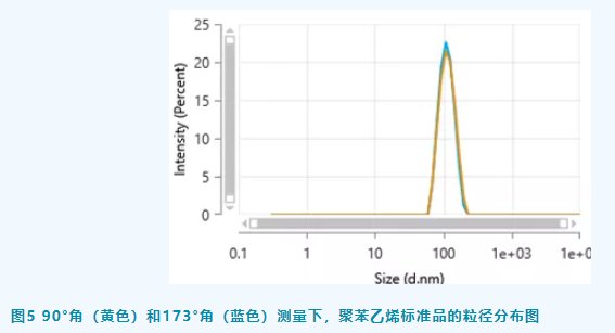 当测试的样品为粒径窄分布时,例如聚苯乙烯标准样品,两种测量角度都能得到很好的粒径分布图,结果也非常一致(图5)。